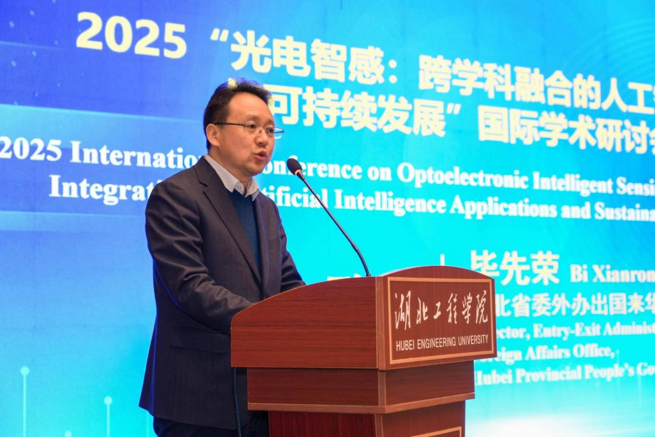 本网讯:12月9日,2025年“光电智感:跨学科融合的人工智能应用与可持续发展”国际学术研讨会在湖北孝感召开。来自国内外众多高校及科研机构的专家学者齐聚一堂,共同探讨光电智感领域的最新研究进展与未来发展方向。本次会议由湖北工程学院、孝感市光电子学会主办,湖北工程学院物理与电子信息工程学院承办,湖北工程学院国际合作与交流处、孝感市委外事工作办公室等单位协办,并得到湖北省物理学会的悉心指导。开幕式由湖北工程学院副校长李渺主持。