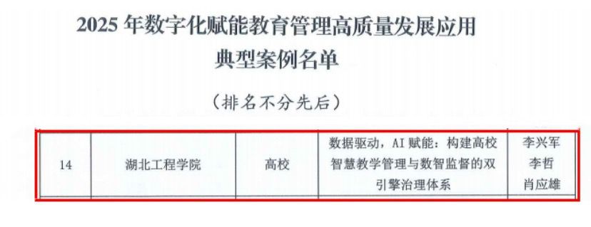 本网讯:近日,湖北省教育信息化发展中心公布2025年数字化赋能教育管理高质量发展应用典型案例名单,全省包括市(州)教育局、高等院校、职业院校及中小学校共43个项目入选,我校报送的《数据驱动,AI赋能:构建高校智慧教学管理与数智监督的双引擎治理体系》名列其中,成为全省11个入选高校典型案例之一。
