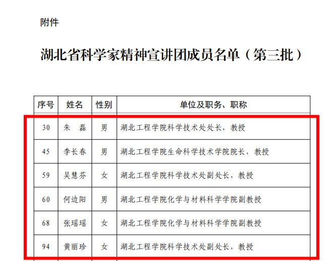 本网讯:近日,湖北省科学技术协会公布湖北省第三批科学家精神宣讲团成员名单,我校朱磊、李长春、吴慧芬、黄丽珍四位教授与何边阳、张瑶瑶两位副教授成功入选。