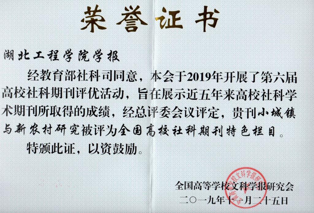 本网讯:近日,经教育部社科司同意,全国高等学校文科学报研究会于2019年开展的第六届高校社科期刊评优活动结果揭晓。经总评委会议评定,《湖北工程学院学报》被评为“全国高校社科优秀期刊”,学报“小城镇与新农村发展研究”栏目被评为“全国高校社科期刊特色栏目”。