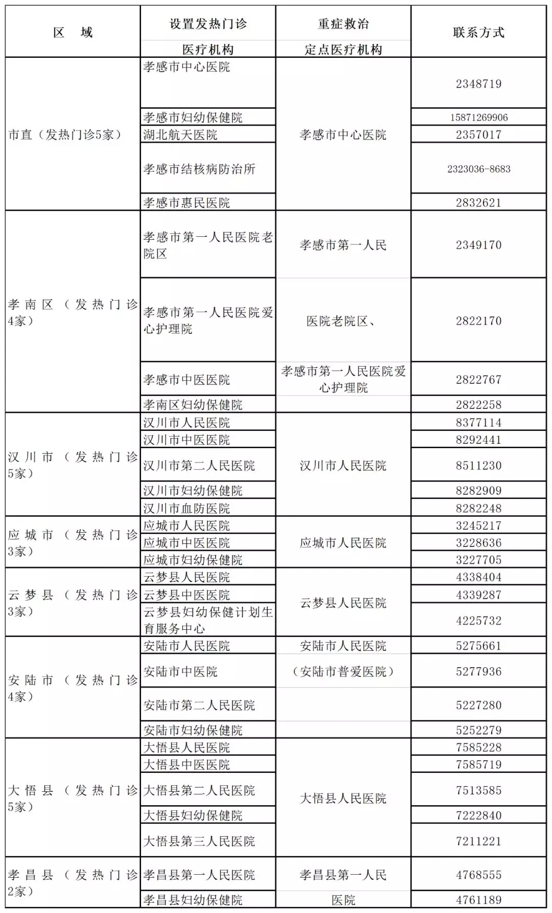 孝感市关于公布31家发热门诊医疗机构和9家定点救治医疗机构名单的公告(2号令)