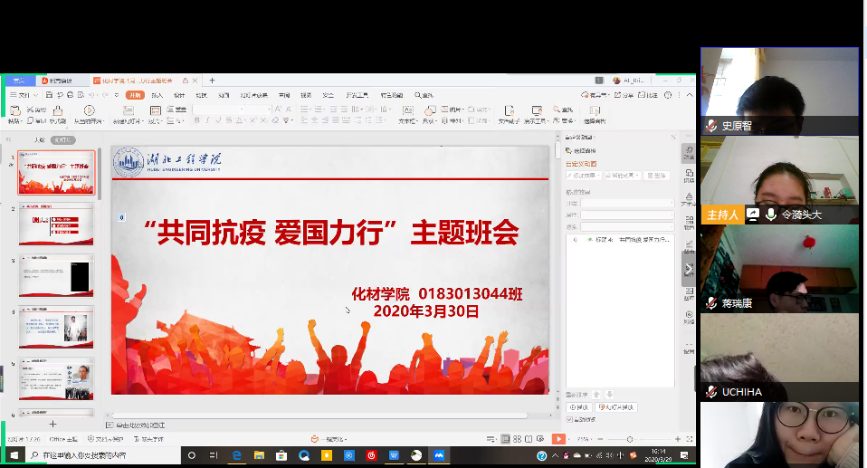 本网讯:3月29日,化学与材料科学学院组织全院学生开展网络主题班会活动,统筹推进疫情防控和新时代爱国主义教育工作。