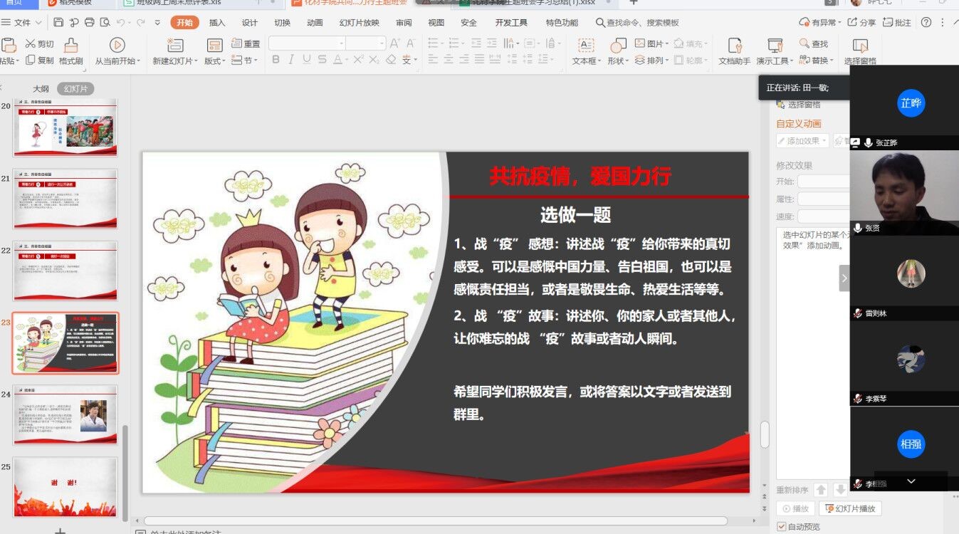 本次班会以“共同抗疫 爱国力行”为主题,主要包括致敬中国精神、疫情最美逆行和青春告白祖国三个部分内容,并组织全院学生开展“青春力行”活动,即停课不停学、停课不停锻炼、进行一次公开承诺、做好一次规划等。各班学生依托QQ群、腾讯会议、钉钉等平台集中时间开展学习讨论,通过开展“防控疫情,我是湖工学子我承诺” 网上承诺活动、中国大学MOOC网络学习、假期锻炼和全面梳理上一学期情况等方式,为新学期做好合理安排和规划,众志成城共同抗疫。