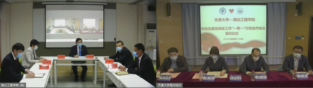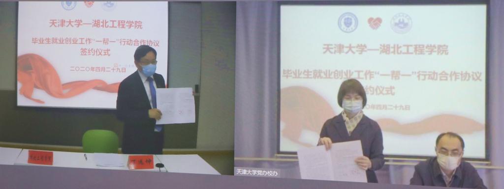 本网讯:4月29日下午,天津大学和湖北工程学院毕业生就业创业工作“一帮一”行动合作协议签约仪式通过线上互联的方式在两校同时举行。天津大学党委副书记雷鸣、湖北工程学院副校长丁远坤代表双方进行“云签约”“云握手”。
