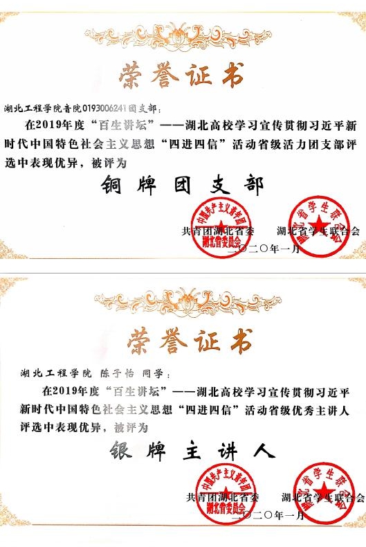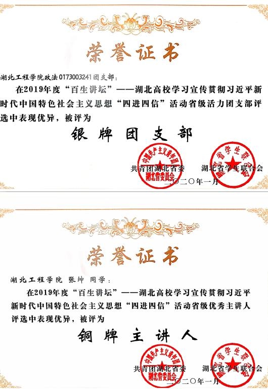 本网讯:在湖北省2019年度“百生讲坛”——学习宣传贯彻习近平新时代中国特色社会主义思想“四进四信”活动省级活力团支部与省级优秀主讲人评选中,我校政治与法律学院0173003241团支部、音乐学院0193006241团支部分别获评“银牌团支部”与“铜牌团支部”荣誉,文学与新闻传播学院陈子怡同学、计算机与信息科学学院张坤同学获评“银牌主讲人”荣誉。