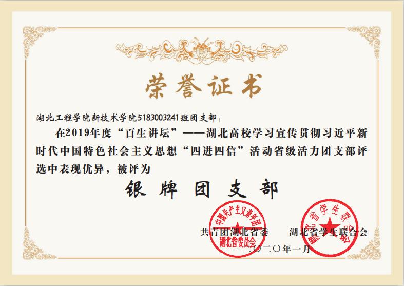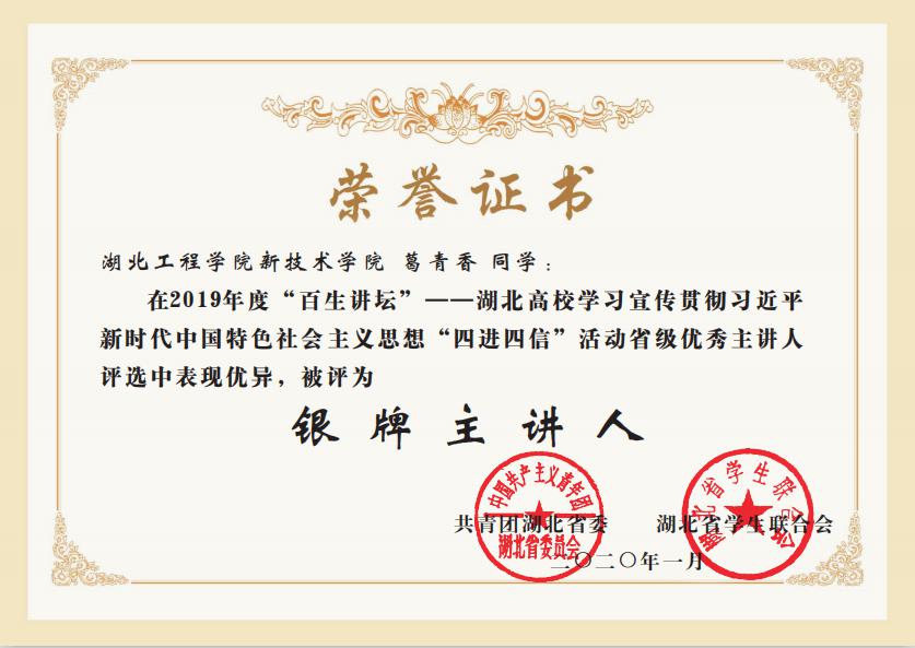 本网讯:日前,团省委公布了2019年湖北省“百生讲坛”——学习宣传贯彻习近平新时代中国特色社会主义思想“四进四信”活动评选结果,新技术学院城市建设系5183003241班团支部荣获“银牌团支部”称号,语言文学系5193001142班葛青香同学荣获“银牌主讲人”称号。
