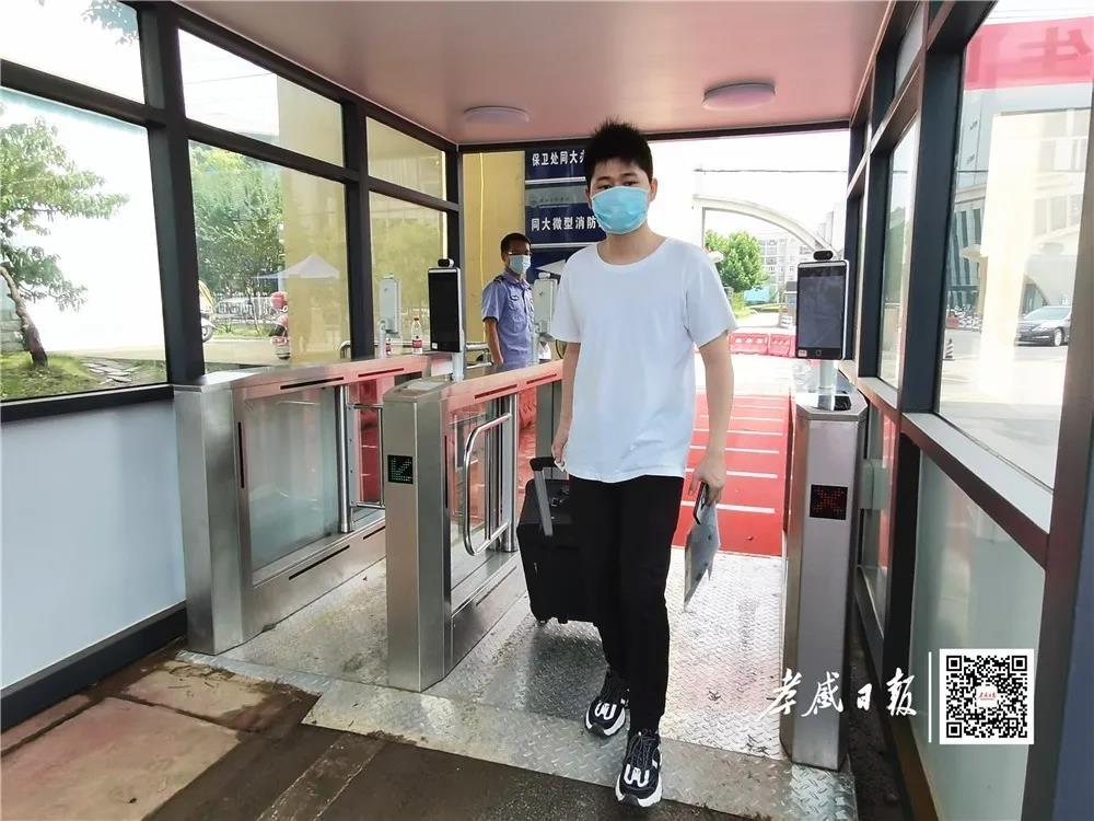 6月15日早上7点半,从江西九江赶回湖北工程学院的大四毕业生许浩,拖着两个行李箱来到学校同大学生公寓门前,经过行李消杀、身份核实、出示核酸检测报告单、迈着激动的步伐通过人脸识别和测温门禁管理系统通道后,正式进入同大学生公寓内。