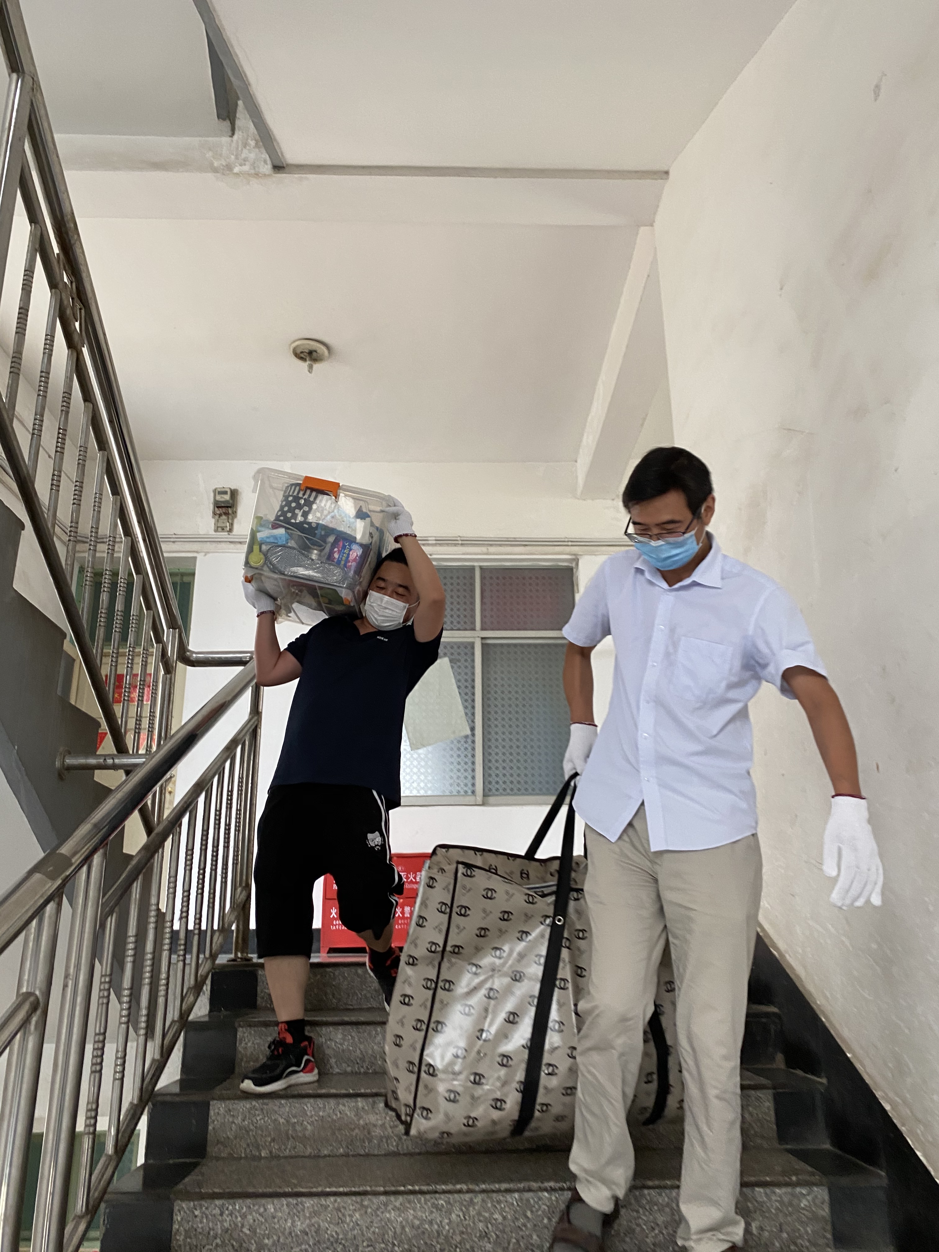 服务队队长谢志兵老师一直坚守在服务毕业生的第一线,每天都带领老师们在三里5栋宿舍楼出出进进,打包、搬运、一趟又一趟,直到背部拉伤。受伤之后,谢老师不下火线,坚持用私家车帮助学生托运行李。