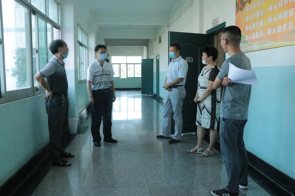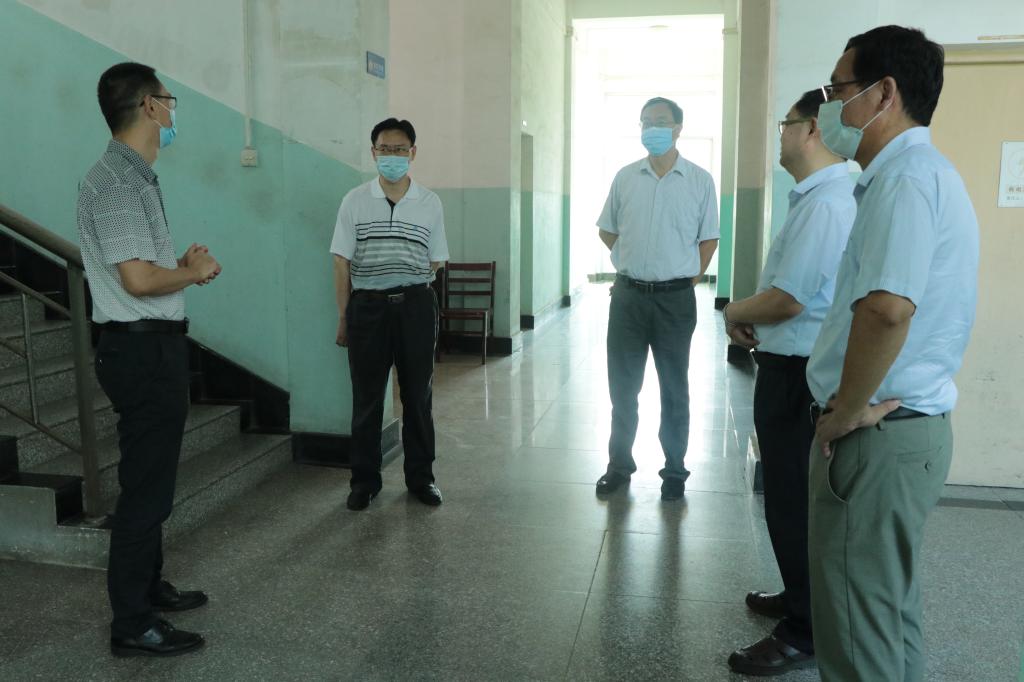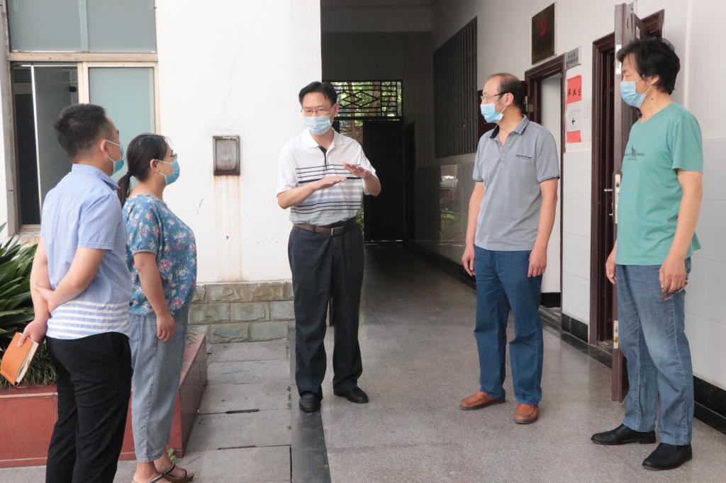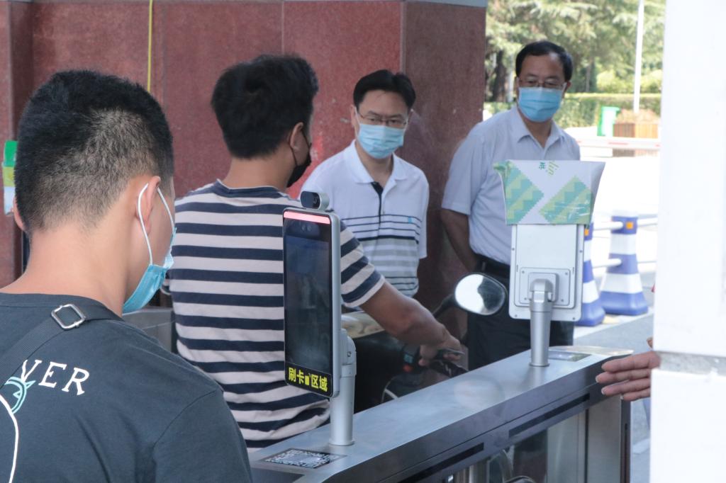 本网讯:8月29日,在校生返校的第一天。校党委书记彭瑜轻车简从,带领校办公室、学生工作部主要责任人,先后到学校南门、西门、图书馆和部分教学学院,实地检查秋季开学各项准备工作。