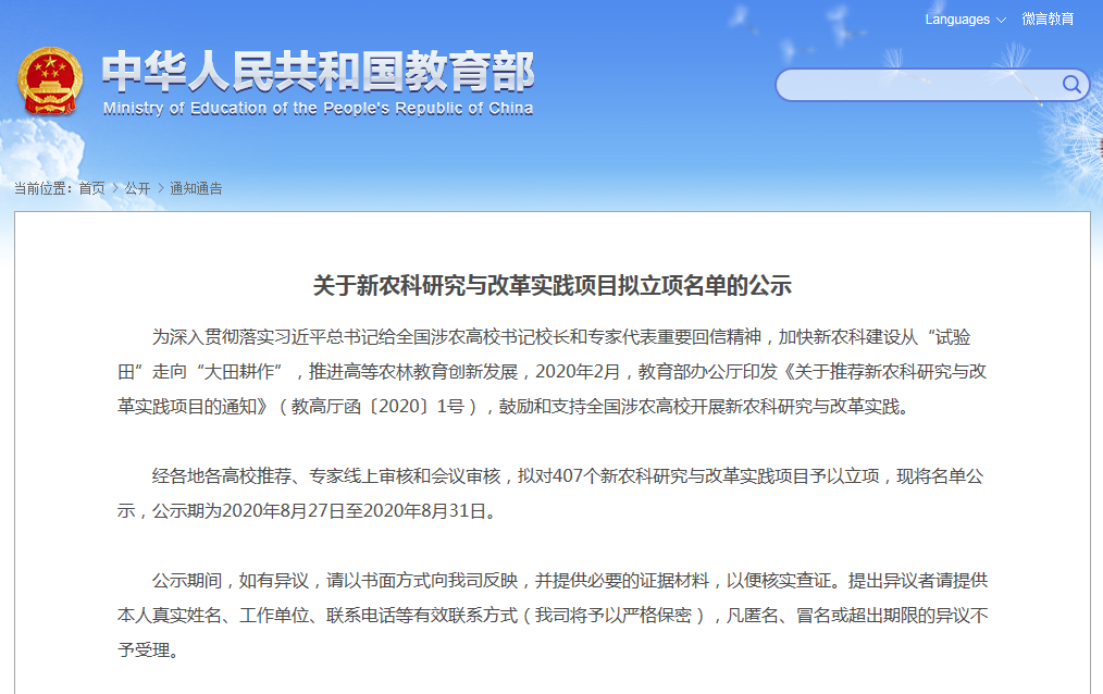 据悉,为深入贯彻落实习近平总书记给全国涉农高校书记校长和专家代表重要回信精神,加快新农科建设从“试验田”走向“大田耕作”,推进高等农林教育创新发展,2020年2月,教育部办公厅印发《关于推荐新农科研究与改革实践项目的通知》(教高厅函〔2020〕1号),鼓励和支持全国涉农高校开展新农科研究与改革实践。经各地各高校推荐、专家线上审核和会议审核,教育部拟对407个新农科研究与改革实践项目予以立项,涉及新农科建设发展理念研究与实践、专业优化改革攻坚实践、新型农林人才培养改革实践、协同育人机制创新实践、质量文化建设综合改革实践等5个领域,共29个方向。理论研究项目周期为1—2年,实践项目周期为4年。