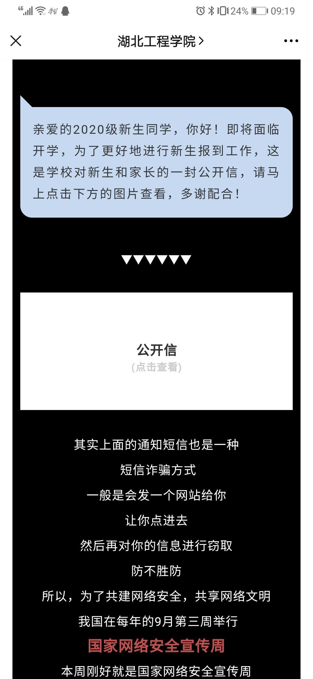 在网络安全宣传周活动期间,学院在校内悬挂相关标语条幅、展出宣传海报。教学学院利用电子屏幕播放网络安全宣传周的主题、视频、口号标语等。通过校园新闻网、湖北工程学院官方微博发布网络安全宣传系列活动新闻,利用“湖北工程学院”微信公众号推送相关知识并在各学院微信公众号平台转发,校内LED电子大屏幕播放网络安全宣传图,通过校园广播台播报网络安全公益广告。