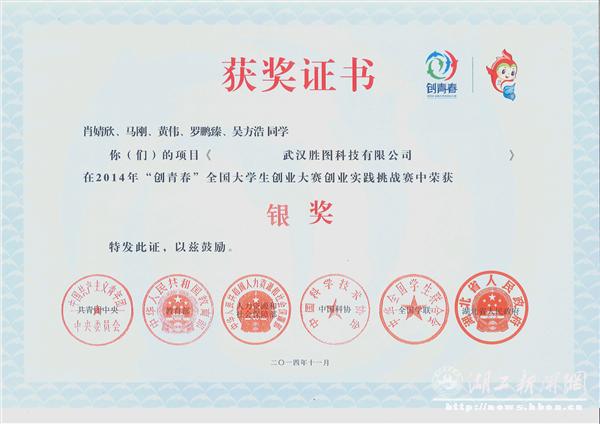 赛前,校团委高度重视,紧紧围绕赛事最新精神,于去年12月启动校内筹备工作,积极联系相关学院、指导教师和学生深入挖掘创新成果,认真组织相关成果申报,积极备战,多次聘请专家参与评审、培训指导并组织模拟答辩。本次大赛自今年1月启动以来,全国共有包括港澳高校在内的2000多所高校参赛。我校美术学院毕业生肖婧欣领衔的创业团队《武汉胜图科技有限公司》成功突围省赛进入全国终审决赛进行现场答辩,并最终获得创业实践挑战赛银奖,这一成绩遥遥领先全国同类高校。我校计算机学院在校生谭建等7位同学共同完成的作品《基于Android平台的连连看游戏设计》获得移动互联网创业专项赛全国铜奖。