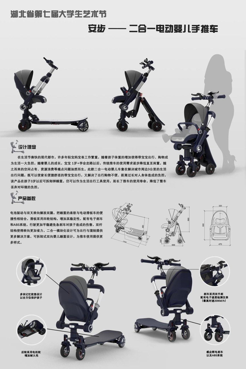 设计类一等奖作品:《二合一电动婴儿平推车》,作者:陈琪,指导老师:赵含