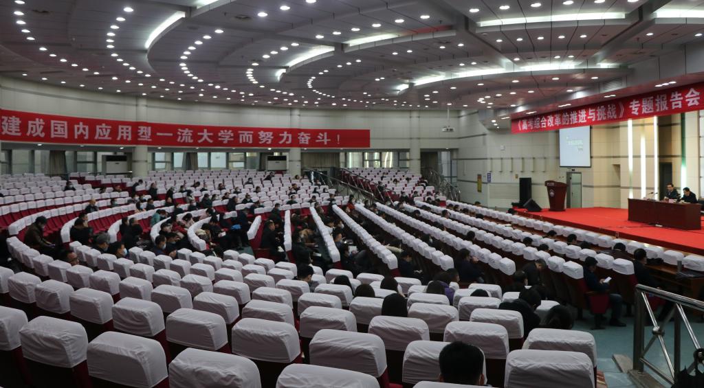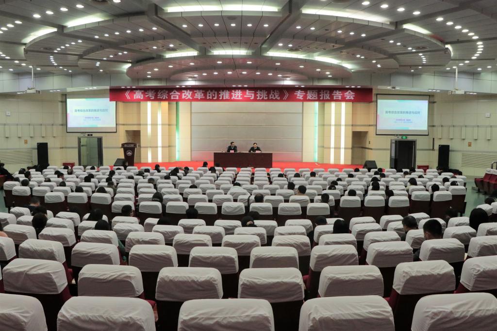 本网讯:3月18日,华中师范大学教授胡向东应邀到我校作《高考综合改革的推进与挑战》专题报告。彭瑜、潘慧明等在校校领导,全体中层干部,教学学院系主任、学科带头人,招就处、教务处全体人员,新技术学院相关人员聆听了报告。报告会由副校长丁远坤主持。