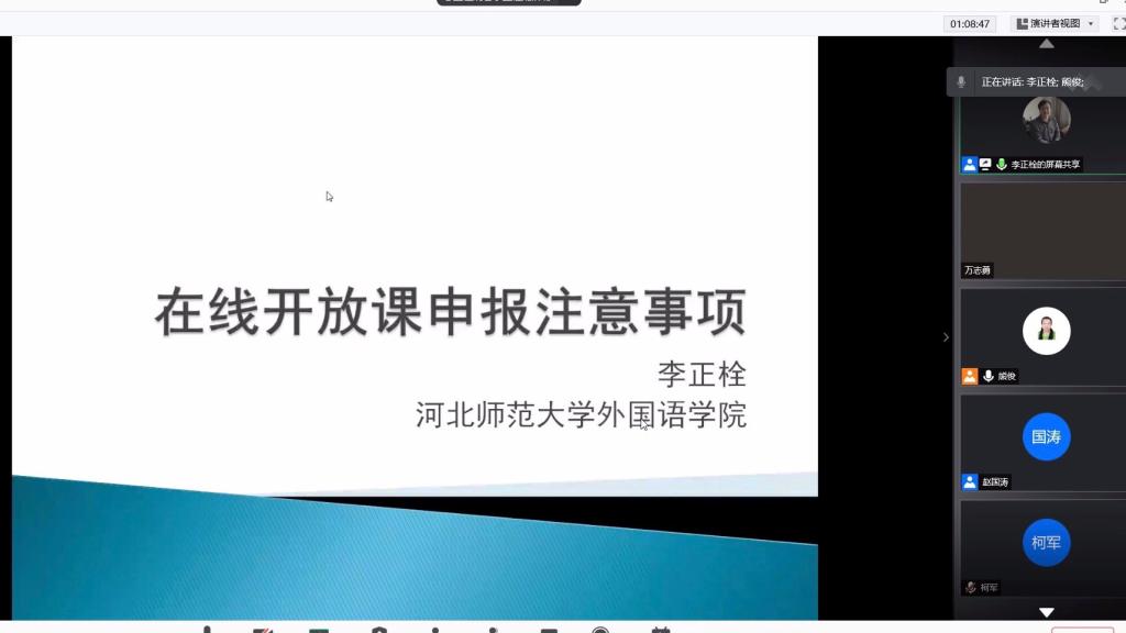 本网讯:3月19日,教育部外国语言文学类专业教学指导委员会英语分委员会委员专家、国家级线上一流本科课程“英美诗歌欣赏”负责人,河北师范大学二级教授、博士生导师李正栓在网络会议平台上为我校教师做了主题为“在线开放课程建设与申报”的讲座。我校外国语学院骨干教师和其他文科院系课程负责人等近百人聆听了讲座,外国语学院副院长、翻译研究中心主任熊俊教授主持讲座。