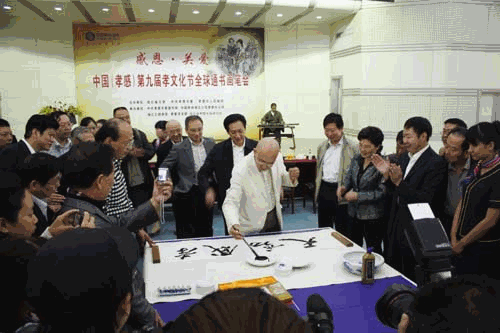 中国移动孝感分公司总经理何立刚致辞说,孝感市第九届中华孝文化书画笔会的开展是弘扬孝文化传统,繁荣孝文化事业,推动孝文化发展的重要活动;是发扬传承孝文化强有力的推手;更是我们力促孝感建设武汉城市圈战略有效实施的形式和方法。