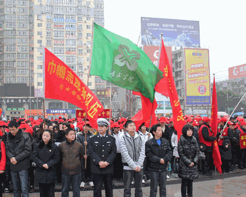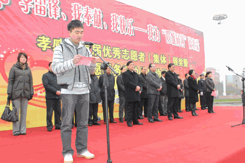本网讯(学生记者 刘义)3月3日,孝感市首届优秀志愿者(集体)颁奖暨“学雷锋、我奉献、我快乐——我为‘四城同创’添光彩”志愿服务活动月在市人民广场启动,我校包括“田强青年志愿服务队”在内的300余名青年志愿者参加。