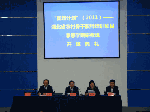 本网讯(学生记者 陈红 金濛)9月21日上午,“国培计划”(2011)——湖北省农村骨干教师培训项目孝感学院研修班开班典礼在格物楼报告厅隆重举行。湖北省教育厅教师管理处调研员严萍,我校副院长丁远坤,教务处处长鲁旭东,“国培计划”孝感学院首席专家邓银城出席了典礼。来自丹江口、赤壁、樊城等14个县市区的240名国培学员及研修专业所在学院领导、学科首席专家参加了典礼。典礼由鲁旭东处长主持。