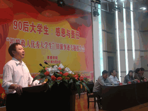 本网讯(学生记者 叶辰爽 朱科 易小丽 江金秀)为了弘扬“田强精神”,培养大一新生的感恩与责任意识,9月9日,“90后大学生:感恩与责任——‘捐髓救人优秀大学生’田强事迹专题报告会”在图书馆学术报告厅举行。出席本次大会的领导和嘉宾有:孝感学院党委书记、湖北孝文化研究中心主任肖波同志,孝感市委宣传部副部长、市文明办主任刘敏同志,孝感学院党委常委、副院长彭汉庆同志,孝感学院新技术学院院长张忠海同志、党委书记王俊同志,孝感学院学工部部长张丽芳同志,优秀大学生田强同学,优秀学生代表马开前、丁洋、王亚斌同学。学校相关职能部门负责人及各学院分管学生工作的党总支书记、团总支书记、辅导员、2011级新生代表参加。上午和下午的报告会分别由孝感学院党委宣传部部长王平同志和孝感学院新技术学院院长张忠海同志主持。
