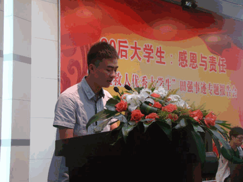 会上,田强简要讲述了自己“捐髓救人”的经过。他表示,常怀感恩之心,勇于承担社会责任是实现个人价值的基本体现。他倡导更多的大学生加入青年志愿者队伍,从身边做起,从点滴做起,以感恩为生活的核心,以奉献为生命的信仰,努力回馈社会。优秀学生代表马开前畅谈了自己的大学生活感受,他感谢学校为他提供的成长平台,并表示将会在今后的生活中努力践行“田强精神”,做勇于担当的新一代大学生。勇救落水儿童的优秀学生丁洋说,生命的意义不在于他的长度,而在于它的高度,身为大学生要心怀他人,乐于奉献。湖北第八届“挑战杯”大学生课外学术科技作品竞赛特等奖代表王亚斌同学说,报效祖国需要知识和信念的支撑,我们要铭记感恩与责任,勤奋学习,勇于创新。