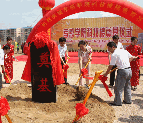 本网讯(特约记者 雷迪 通讯员 李露 齐吉)蓝天白云相伴,气球彩旗飘展。6月1日上午,同大北区礼花绽放,鞭炮齐鸣。在我校师生的翘首期盼中,科技楼破土动工。孝感学院副院长、新技术学院董事长覃彩芹,孝感学院副院长徐玉琼,新技术学院院长张忠海、党委书记王俊、常务副院长叶建勇出席了奠基仪式。孝感学院办公室、资产后勤与管理处、纪检审和科技楼承建单位相关负责人参加仪式。