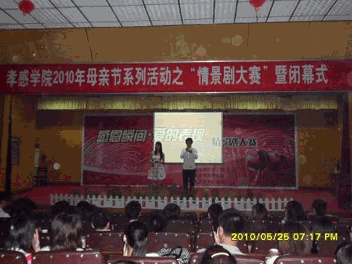 本网讯5月25日晚,2010年母亲节系列活动之“情景剧大赛”在教一楼学术报告厅隆重举行。校学生会、校团联、校广播台、院报等校级组织的学生负责人担任了本次母亲节情景剧大赛的评委,各学院派队参加了本次大赛。