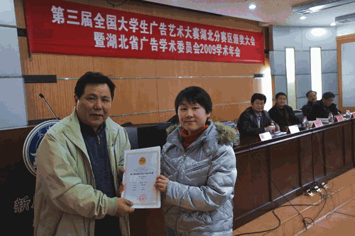 本网讯(特约记者黄晔学生记者谢小华报道)12月23日,我校应邀参加在武汉大学召开的第三届全国大学生广告艺术大赛湖北分赛区颁奖大会暨湖北省广告学术委员会2009学术年会。文学与新闻传播学院党总支书记汪又发副教授、副院长彭爱萍副教授和张洁老师代表学校参加。