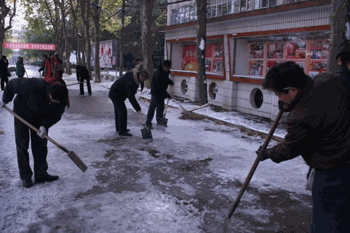 为了不让冰雪给师生们出行造成困难,在后勤服务中心的统一布置下,房管科出动全体人员,从11月17日凌晨4点半开始,对人流较多路段积雪进行清扫铲冰。8点20分,在后勤服务中心主任祝玉芳同志的组织和带领下,中心办公室、膳食科、宿管科、水电科等部门共50余名职工参加了扫雪铲冰,清扫了通往学生食堂、教学楼、学生公寓、图书馆、办公楼等主干道的冰雪,中心各部门还采取了各种措施,餐厅和图书馆门口都铺设了地毯和麻袋防滑,以保证全院教职工和学生的正常生活和学习。