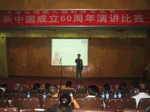 在主持人宣布完评分标准后,比赛正式开始。比赛有主题演讲、即兴演讲和现场问答三个环节。每位选手都有备而来,评委和观众的思绪随着选手们的演讲在中国几千年的历史里驰骋,情感也不由跌宕起伏,时而愤慨,时而欣喜,时而骄傲。选手们都在演讲中畅谈自己心中的新中国,表达对祖国的美好祝福。随着那一段段文辞优美的叙述,大家也仿佛与每位选手共同经历新中国成立六十年的风风雨雨,与祖国共同成长,共同进步。