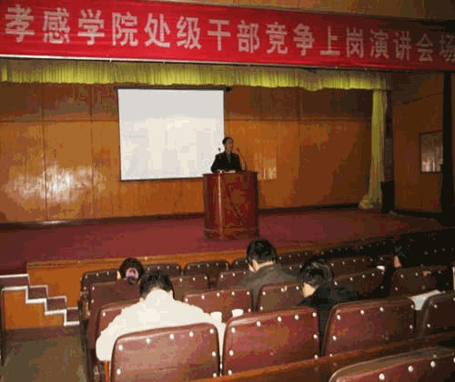 本网讯 (学生记者 李晓青 谭畅 万芬 报道)3月12日上午,孝感学院竞争上岗选拔部分处级干部竞职演讲在文学院报告厅和教一栋报告厅举行。此次竞选旨在面向全校公平、公正、公开地选聘部分干部,进一步推进干部人事制度改革。据悉,学校现任正、副处级,科级干部及教授、博士等踊跃报名,目前共有39位候选人竞争宣传部部长、统战部部长等十个岗位。(图为本次竞职演讲的现场。)