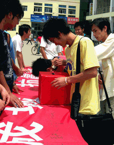 本网讯(学生记者 聂延强 报道)获悉“5.12”四川汶川县特大地震造成重大灾害和人员伤亡后,我校师生纷纷表达关切之情并积极参加募捐活动。