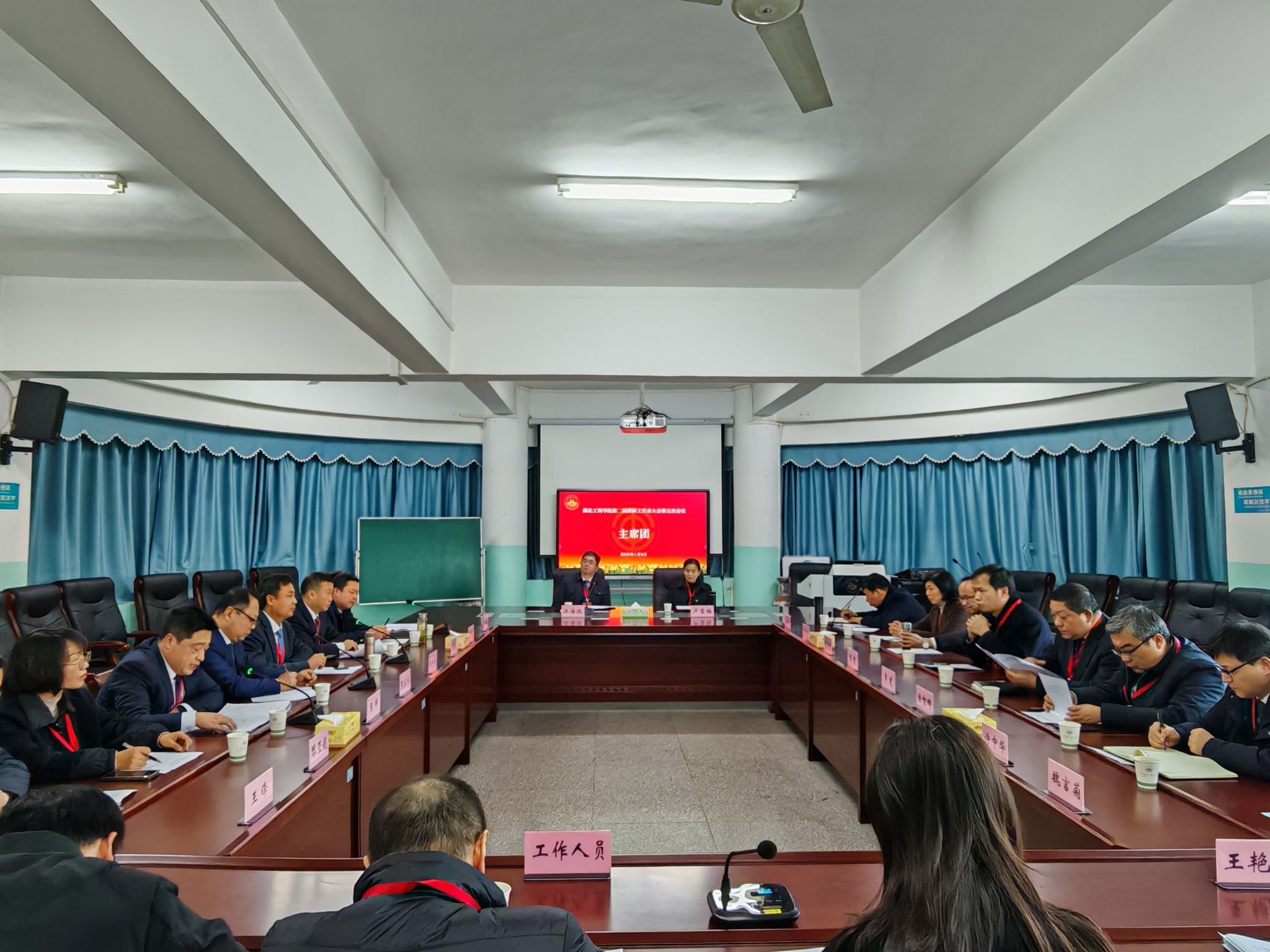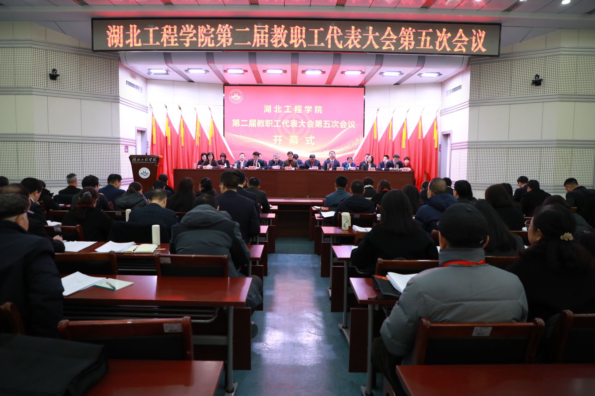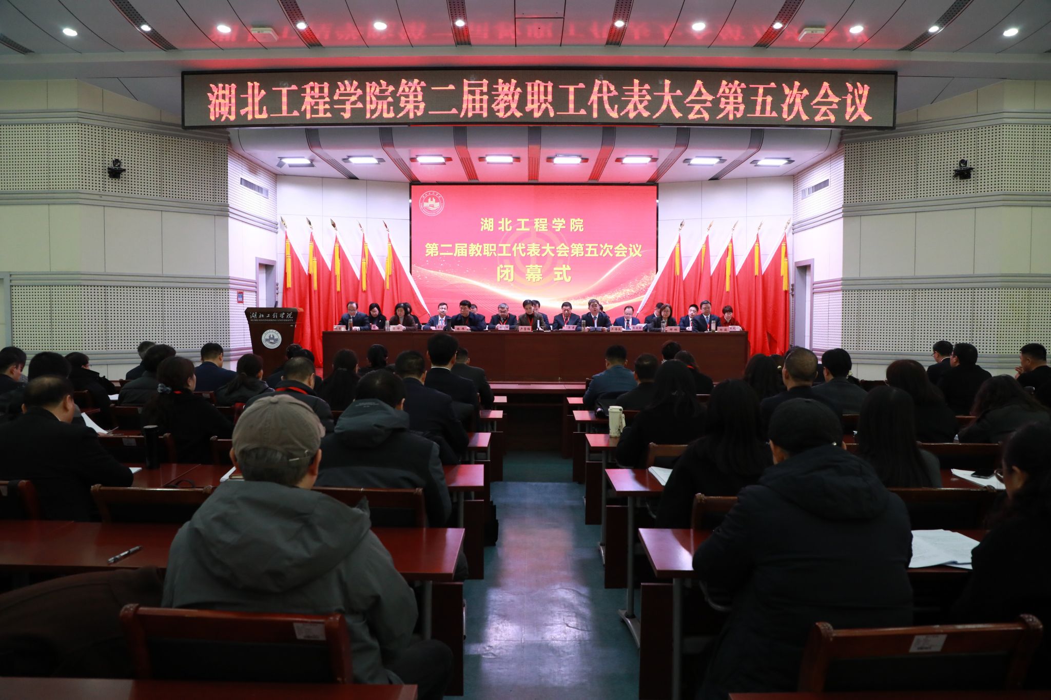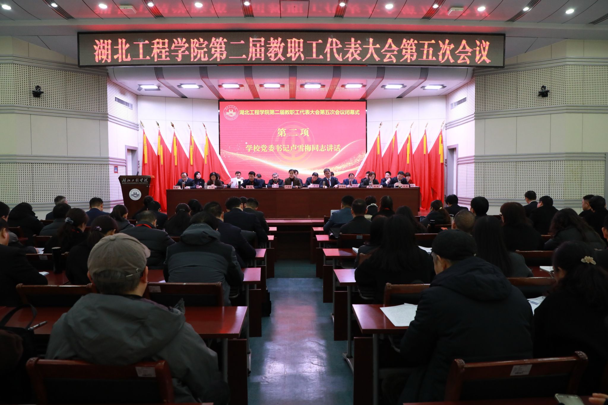 本网讯:1月9日,湖北工程学院第二届教职工代表大会第五次会议在文学楼报告厅胜利召开。校领导卢雪梅、汪海波、陈伟、邹虹、李渺、郑俊、熊曾刚出席会议。大会主席团成员在主席台就座。上午的开幕会由学校党委副书记、工会主席陈伟主持,党委副书记、校长汪海波主持了下午的闭幕会。