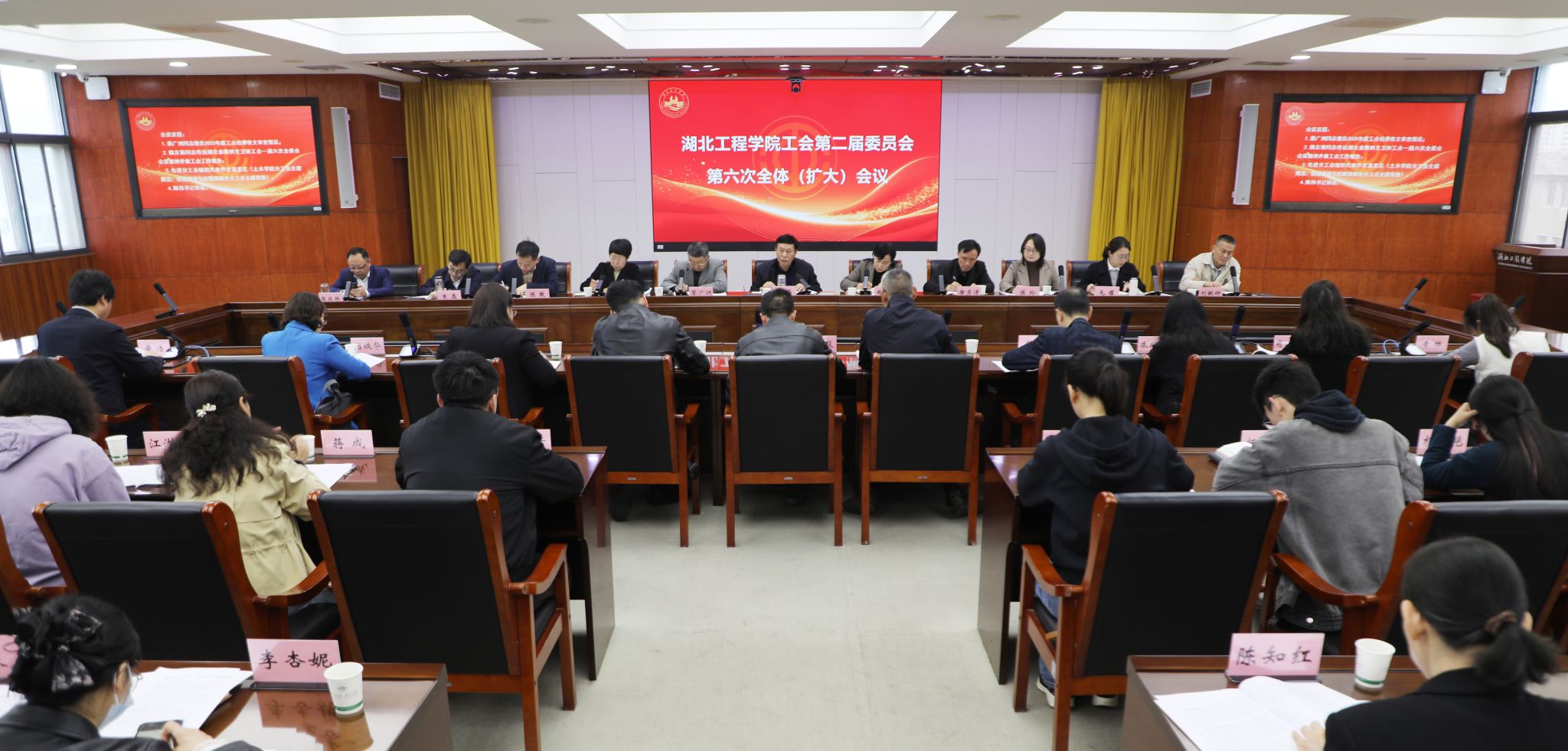本网讯:4月3日,湖北工程学院工会第二届委员会第六次全体(扩大)会议在明德楼六楼会议室召开。学校党委副书记、工会主席陈伟出席会议并讲话,工会第二届委员会委员、经审委员会主任及分工会主席参加会议。会议由校工会副主席王艳丽主持。