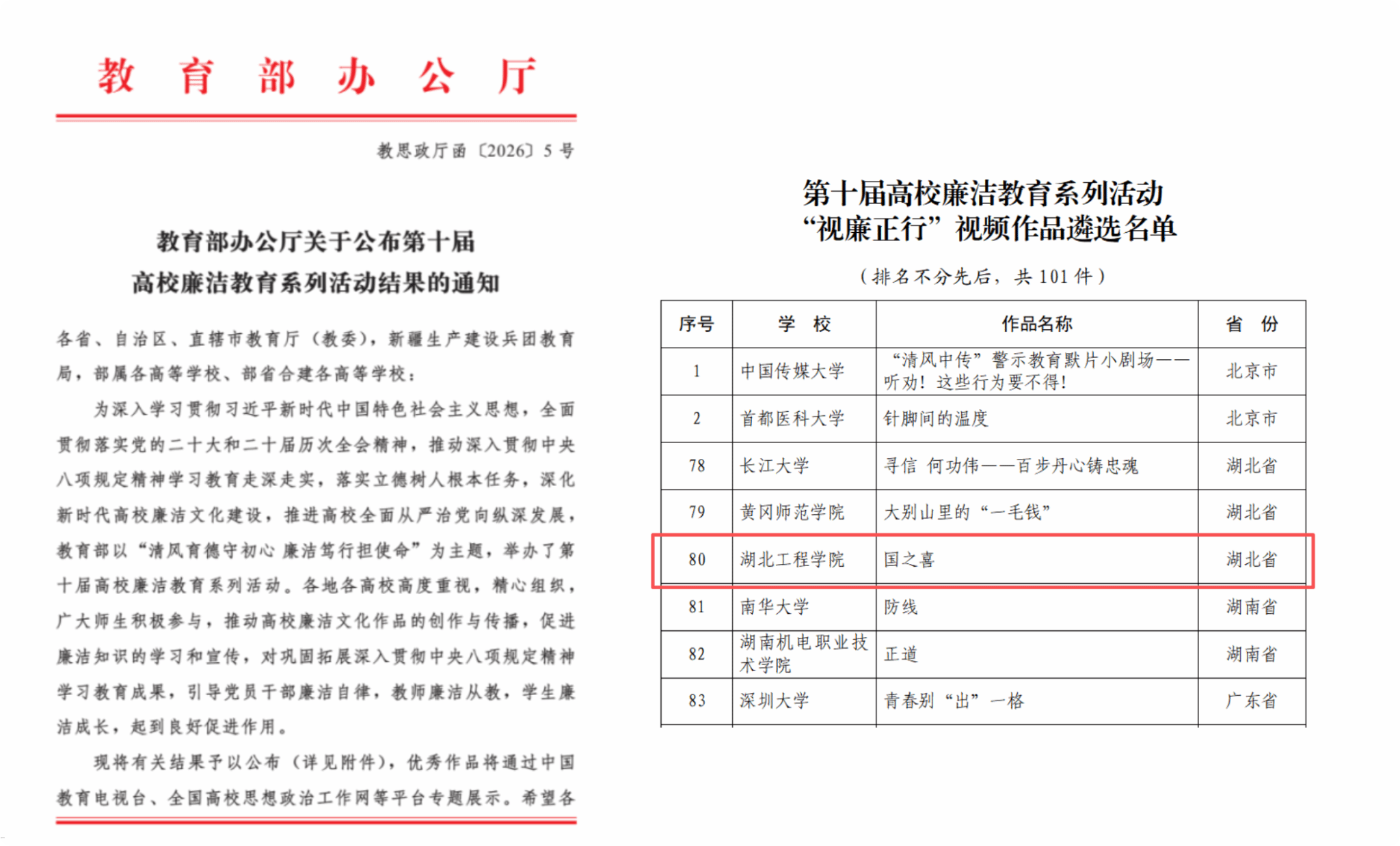 本网讯:近日,教育部发布《关于第十届高校廉洁教育系列活动结果的通知》,我校原创话剧《国之喜》从全国众多作品中脱颖而出,成功入选优秀作品。这是对我校廉洁文化建设与美育实践的高度肯定,也是“孝爱中国·情满湖工”文化育人品牌的又一重要成果。