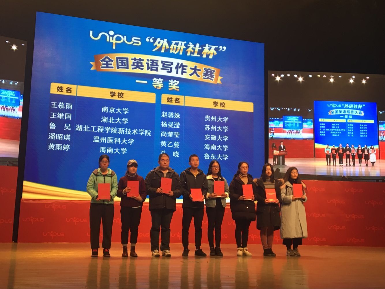 本网讯:12月9至11日,2016年“外研社杯”全国英语写作大赛总决赛在北京外研社国际会议中心举行,新技术学院英语专业鲁昊同学获得一等奖,这是该院乃至湖北省独立院校系统在该项目取得的最好成绩。该院郑红艳教授荣获指导教师一等奖。
