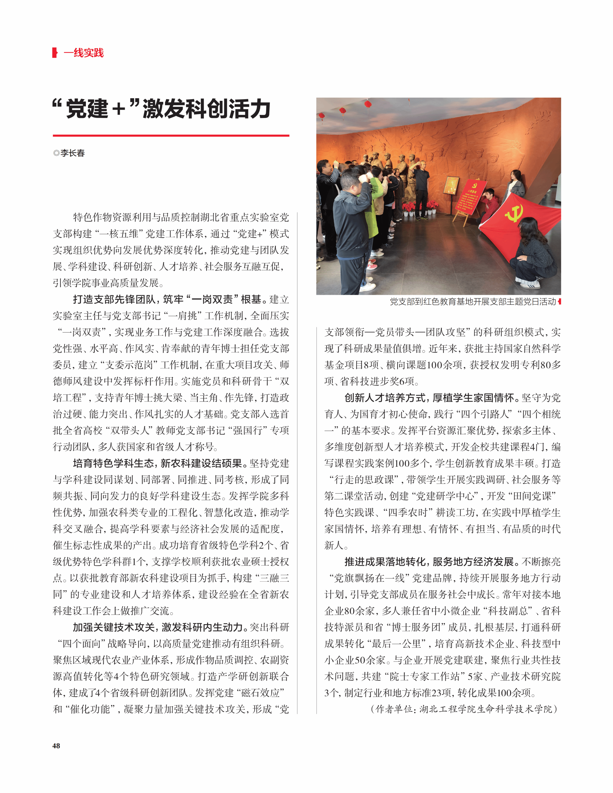 加强关键技术攻关,激发科研内生动力。突出科研“四个面向”战略导向,以高质量党建推动有组织科研。聚焦区域现代农业产业体系,形成作物品质调控、农副资源高值转化等4个特色研究领域。打造产学研创新联合体,建成了4个省级科研创新团队。发挥党建“磁石效应”和“催化功能”,凝聚力量加强关键技术攻关,形成“党支部领衔-党员带头-团队攻坚”的科研组织模式,实现了科研成果量质俱增。近年来,获批主持国家自然科学基金项目8项、横向课题100余项,获授权发明专利80多项、省科技进步奖6项。