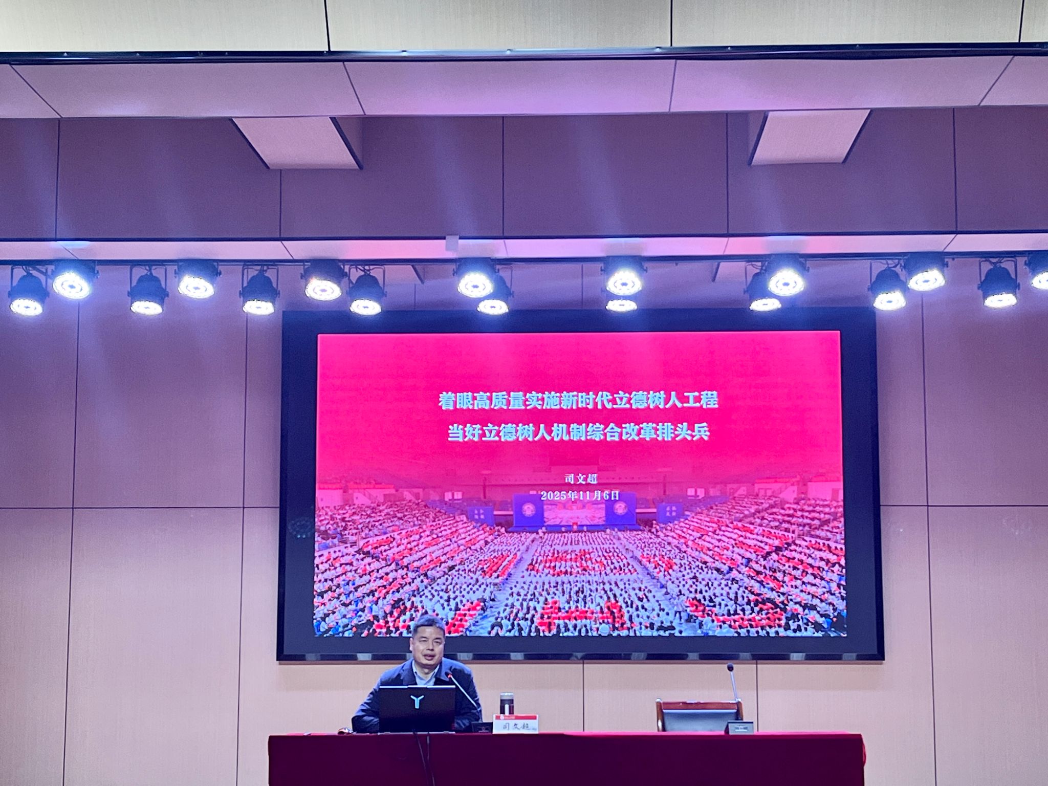 教育部高校思想政治工作创新发展中心(武汉大学)副主任、武汉大学党委宣传部副部长司文超老师以《着眼高质量实施新时代立德树人工程 当好立德树人机制综合改革排头兵》为题作专题分享。他强调,要深入学习贯彻习近平总书记关于立德树人的重要论述,学深悟透新思想新观点新论断,立足新时代方位、把握新阶段特征、强化新举措力度,树立系统观念、归零心态、集成思维,发扬敢为人先的精神,不断增强思政引领力,落实好新时代立德树人工程及立德树人机制综合改革的各项任务。
