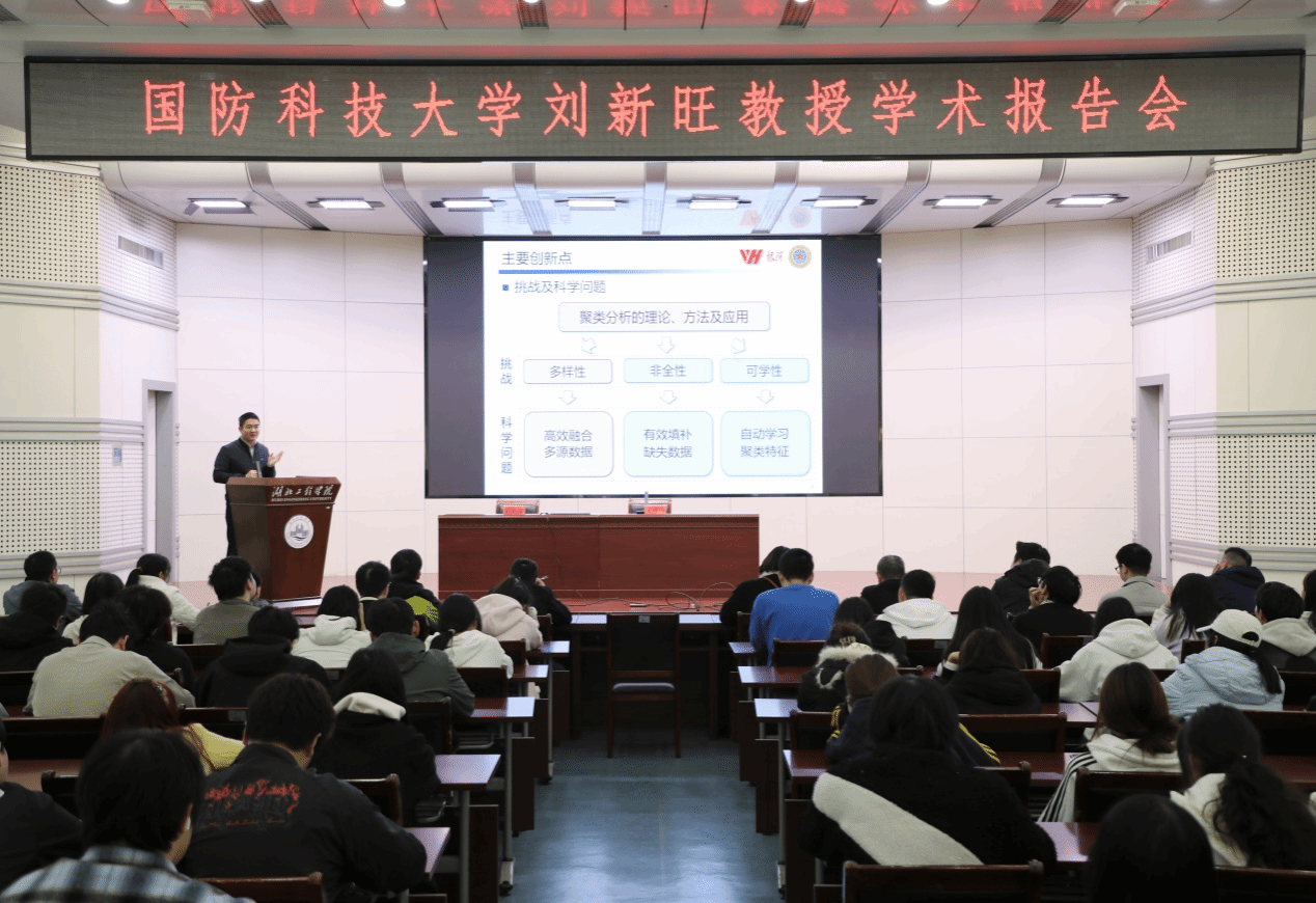 刘新旺教授首先介绍了聚类分析的研究背景与基础知识,随后围绕数据特征多样化、信息不完整和弱可学习性等关键科学问题,系统介绍了课题组在多视图聚类融合、非完整多视图聚类及深度聚类等方向取得的研究进展与创新成果。刘教授重点讲解了新的聚类分析理论框架的构建思路与性能提升方法,并分享了未来该领域的研究方向与发展构想。报告内容紧扣学科前沿,体现了理论创新与应用探索的有机结合,为现场师生奉献了一场内容充实、启发深刻的学术盛宴。在交流环节,计算机学院师生踊跃提问,问题涵盖科研、教学、考研与数据分析等多个方面。刘教授耐心解答,并结合自身科研实践分享了宝贵经验与见解。