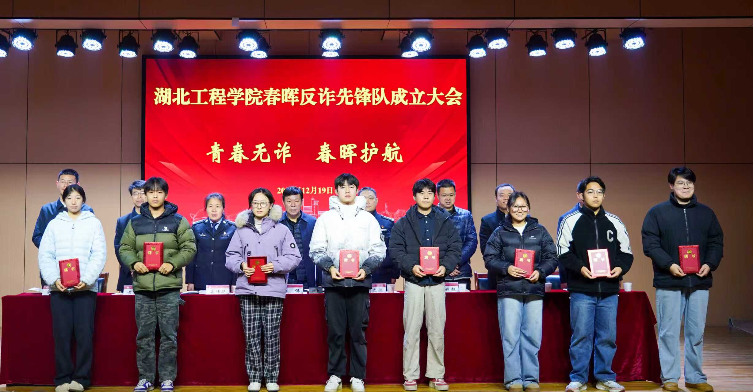 本网讯:12月19日,学校“春晖反诈先锋队”成立大会在教一栋报告厅举行。学校党委副书记陈伟、孝感市公安局相关反诈宣传民警、三里棚派出所负责人及学校学生工作部、保卫处、团委、各学院相关负责人,与先锋队成员、学生代表共同参会,见证先锋队成立。