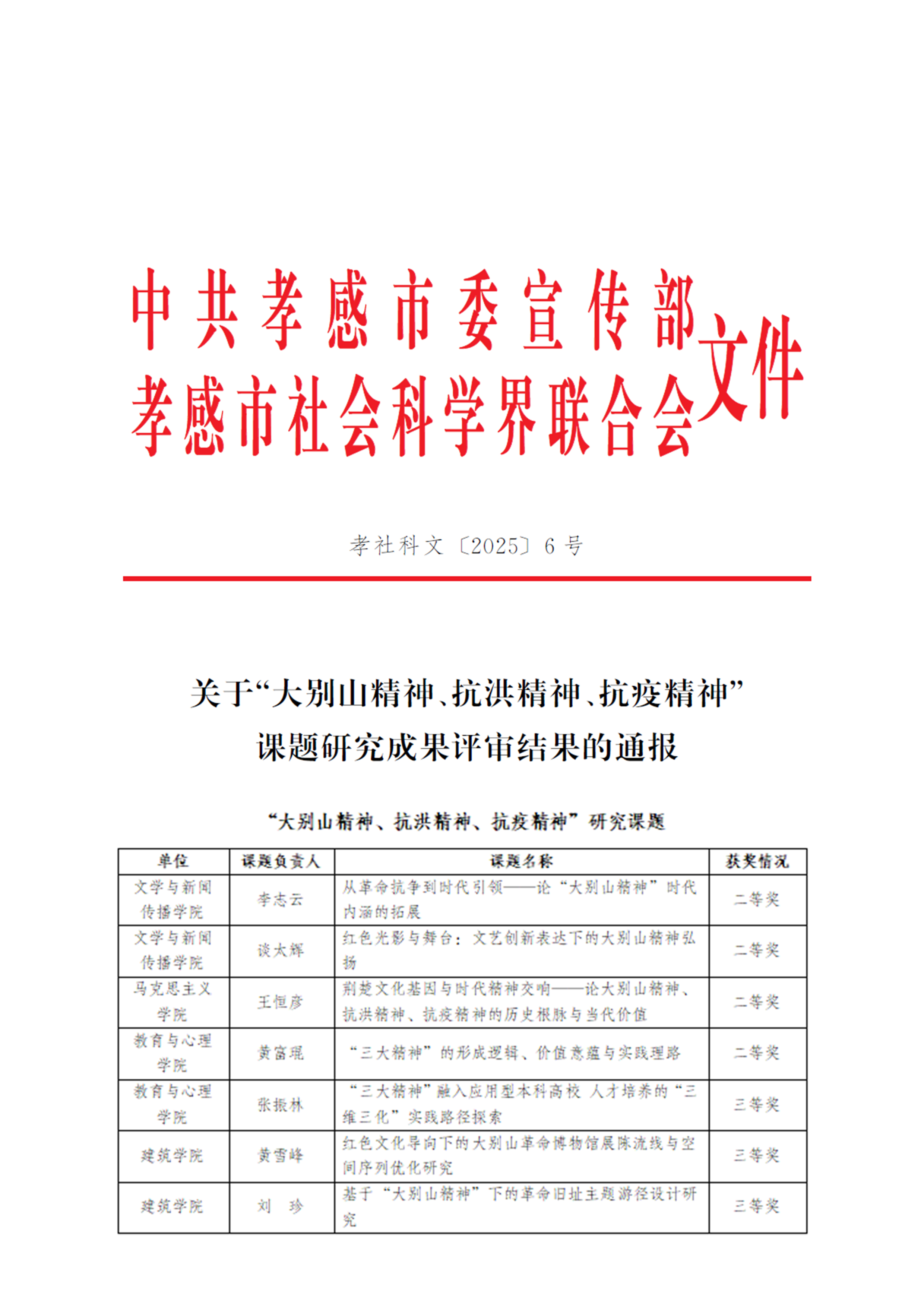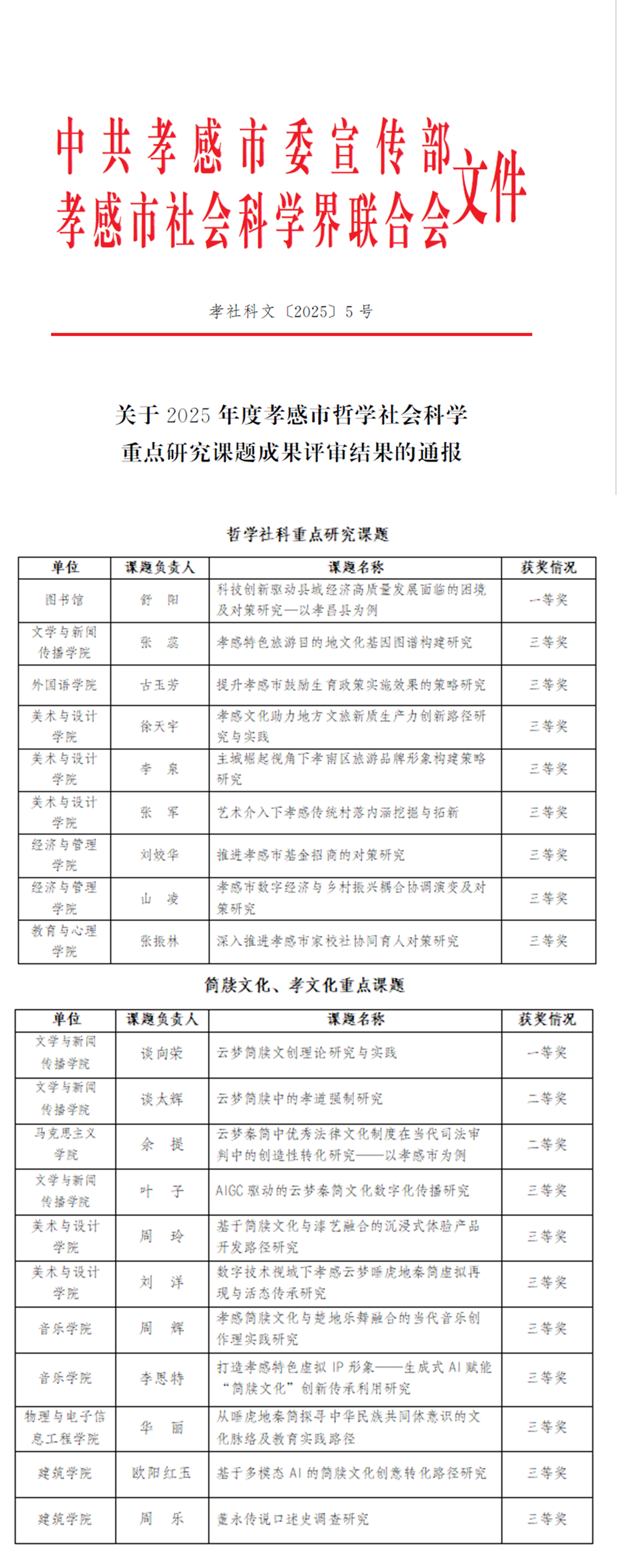 本网讯:近日,中共孝感市委宣传部、孝感市社会科学界联合会联合公布了《关于2025年度孝感市哲学社会科学重点研究课题成果评审结果的通报》(孝社科文〔2025〕5号)和《关于“大别山精神、抗洪精神、抗疫精神”课题研究成果评审结果的通报》(孝社科文〔2025〕6号)。在全市194项参评课题成果中,我校70位教师的研究课题顺利通过结项验收,获奖等次与数量在全市各单位中名列前茅,彰显了学校在地方特色文化研究与社科应用研究领域的扎实功底。