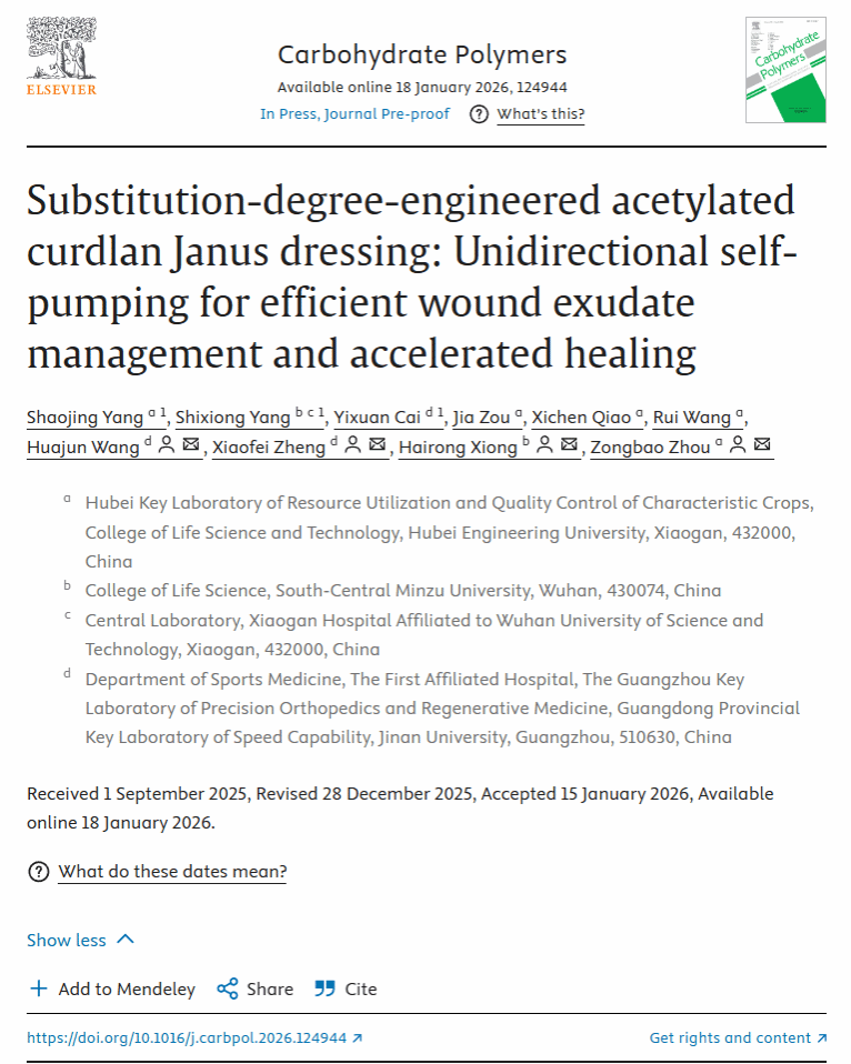 本网讯:近日,我校生命科学技术学院2023级药学专业本科生杨绍晶作为第一作者,在国际知名学术期刊《Carbohydrate Polymers》(SCI中科院一区,影响因子12.5)上发表了题为《Substitution-degree-engineered acetylated curdlan Janus dressing: Unidirectional self-pumping for efficient wound exudate management and accelerated healing》的研究论文,充分彰显了我校在本科生科研创新能力培养上的深厚积淀与育人实效。