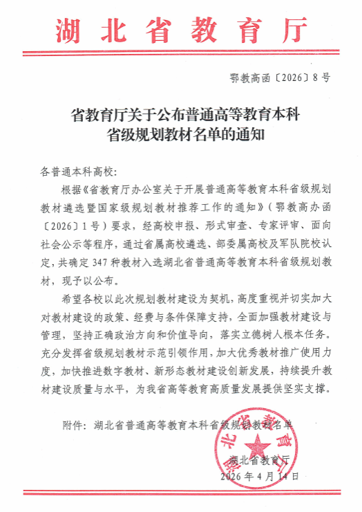 本网讯:近日,湖北省教育厅公布普通高等教育本科省级规划教材名单,我校2项教材成功入选,其中1项教材成功入围推荐参评国家级规划教材。此次取得的成绩在省内同类高校中位居前列,彰显了我校在教材建设领域的扎实成效。