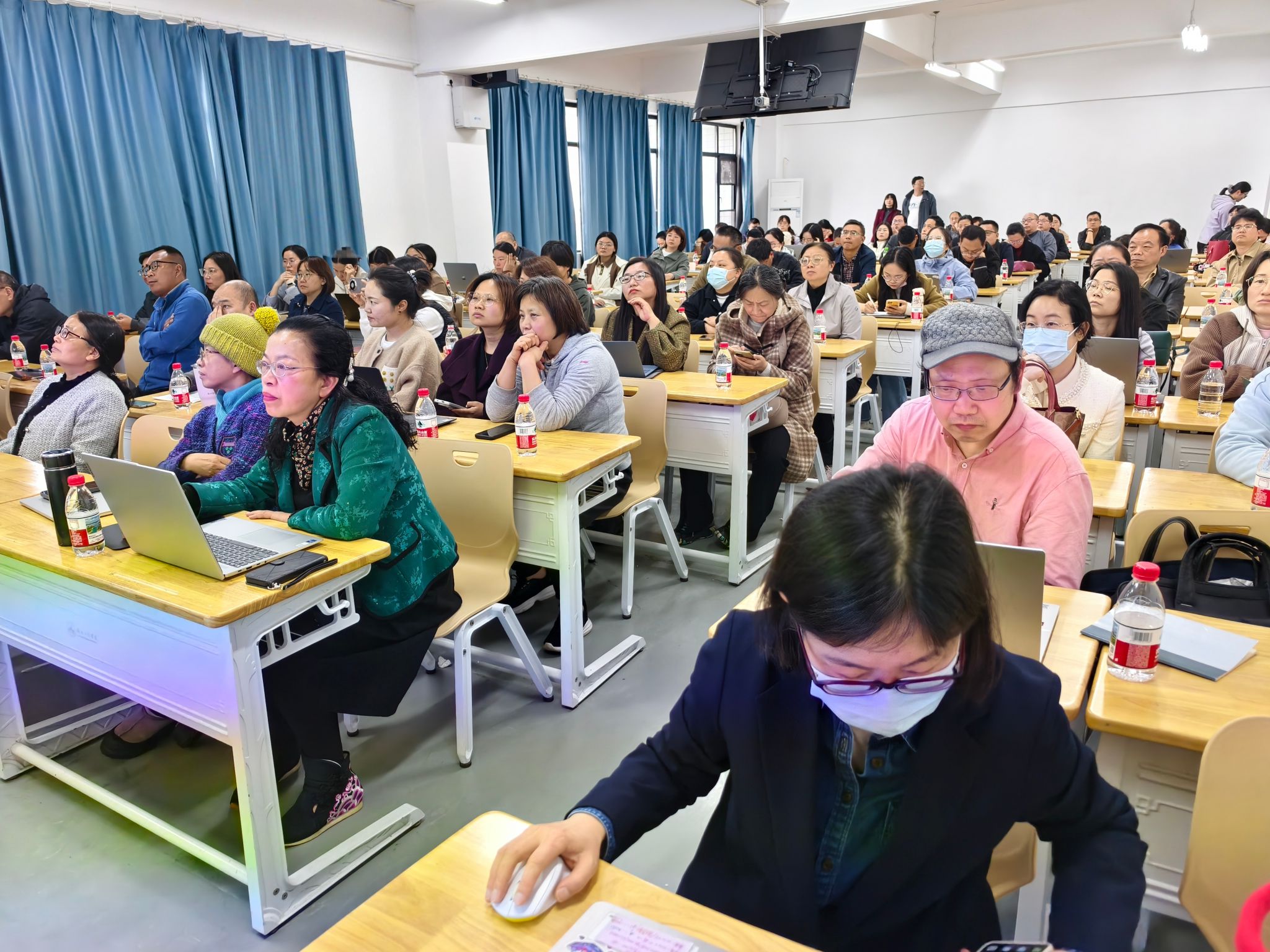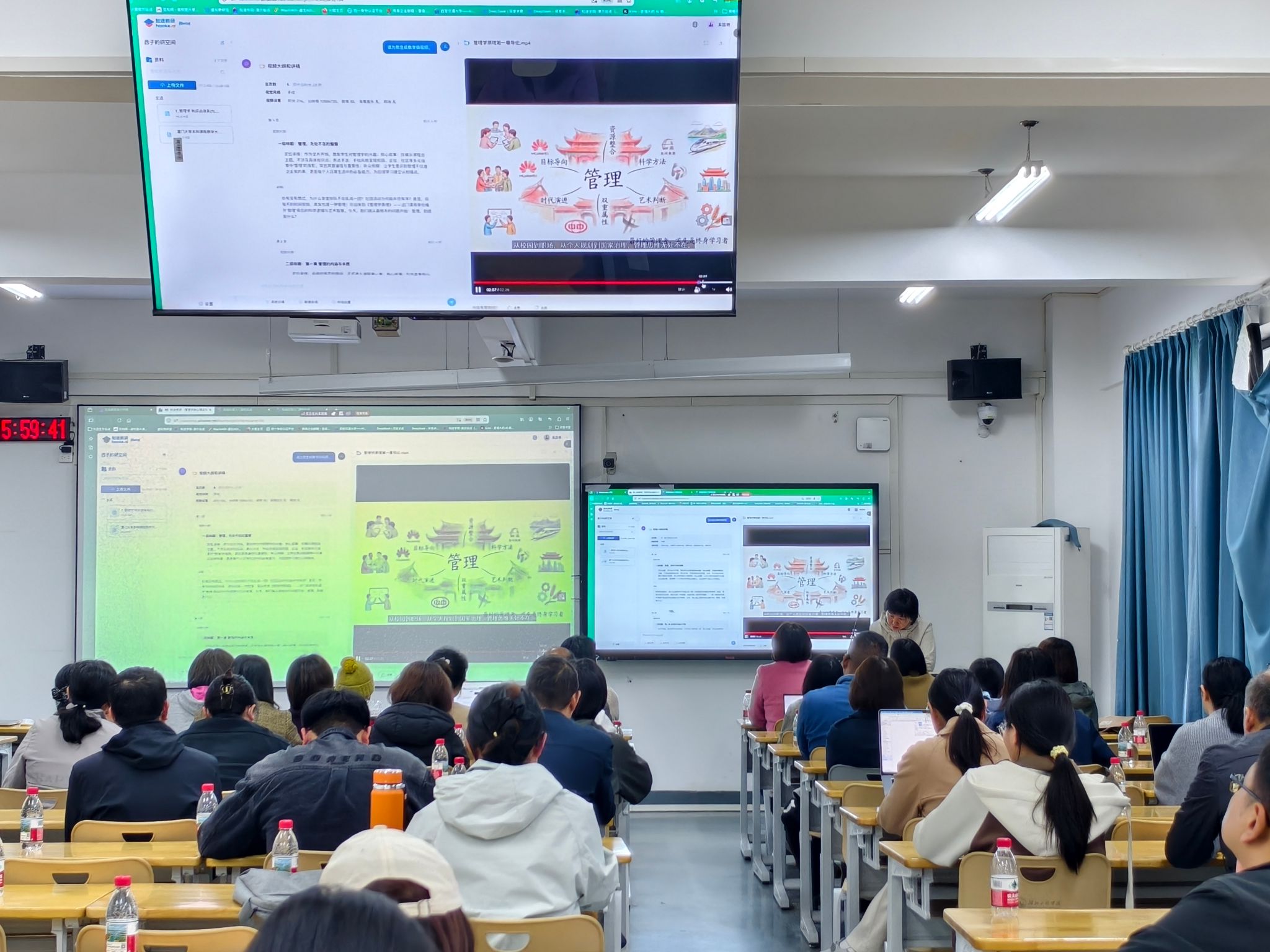 本网讯:为深入贯彻落实国家教育数字化战略行动部署,持续深化人工智能技术与教育教学全过程深度融合,贯彻落实学校“干部素质提升年”的相关要求,深入推进我校教育数字化转型,助力教师智慧教学能力提升,4月23日下午,信息技术中心联合教务处在三园区二号楼411教室组织开展“AI赋能教师智慧教学能力提升专题培训”,各教学学院骨干教师100余人参与培训活动。