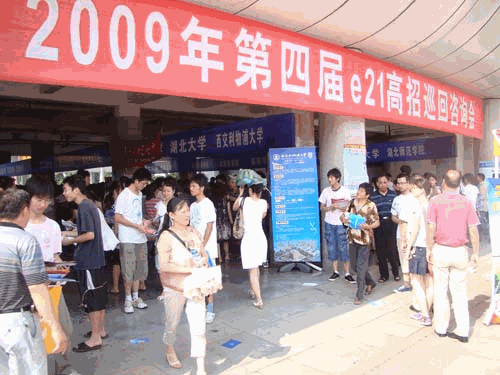 本网讯(学生记者 张秦 报道)6月27日上午,2009年第四届e21高招巡回咨询会在我校图书馆一楼大厅隆重举行。本次咨询会共有来自武汉大学、华中科技大学、华中农业大学、武汉理工大学、西安交通大学等著名大学在内的全国第一、二、三、四各批次一百多所高校的招生办负责人参加。这种“零距离接触”的方式为考生提供全面、真实、实用的志愿填报信息,吸引了众多周边地区的考生、家长前来咨询。